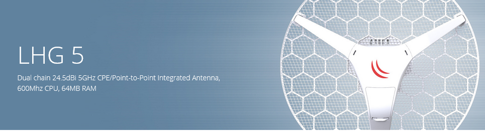 The LHG 5 is a compact and light 5GHz 802.11 a/n wireless device with an integrated dual polarization 24.5 dBi grid antenna at a revolutionary price. It is perfect for point to point links or for use as a CPE at longer distances and supports Nv2 TDMA protocol.