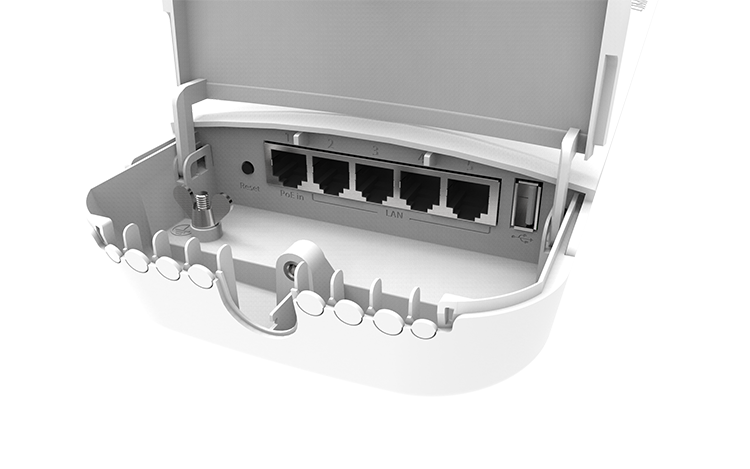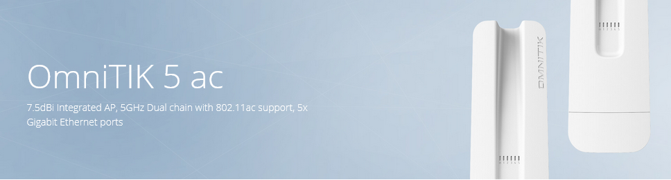 OmniTIK 5 ac features five Gigabit Ethernet ports and support for 802.11ac. It’s equipped with a powerful 720MHz CPU, 128MB RAM, high power 802.11a/n/ac Dual Chain wireless (support for AC as well as backwards compatible with regular 802.11a/n CPE) and comes with a new design weatherproof outdoor enclosure, two integrated 7.5dBi 5GHz omni antennas, a power supply, a PoE injector and a mounting kit.