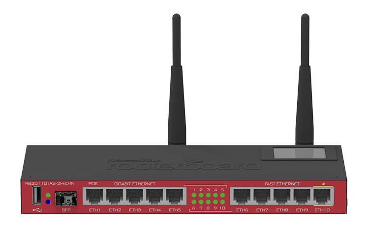 RouterBOARD 2011UAS-2HnD-IN comes with desktop enclosure, LCD panel and power supply.