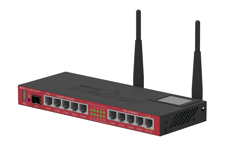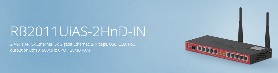 RouterBOARD 2011UiAS-2HnD has most features and interfaces from all our Wireless routers. It’s powered by the new Atheros 600MHz 74K MIPS network processor, has 128MB RAM, five Gigabit LAN ports, five Fast Ethernet LAN ports and SFP cage (SFP module not included!). Also, it features powerful dual chain 2.4Ghz (2312-2732MHz depending on country regulations) 802.11bgn wireless AP, RJ45 serial port, USB port and RouterOS L5 license, as well as desktop case with power supply, two 4dBi Omni antennas and LCD panel.