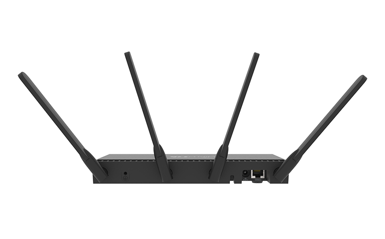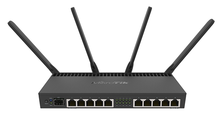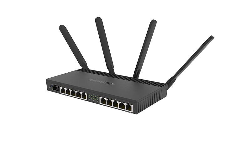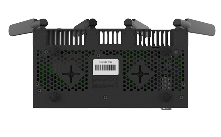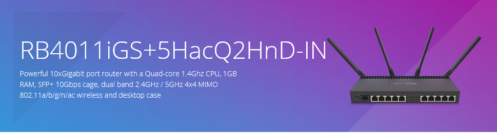 RB4011iGS+5HacQ2HnD-IN (WiFi model) is dual band, four chain unit with a supported data rate of up to 1733 Mbps in 5GHz. For legacy devices, the unit also has a dual chain 2GHz wireless card installed in miniPCI-e slot.